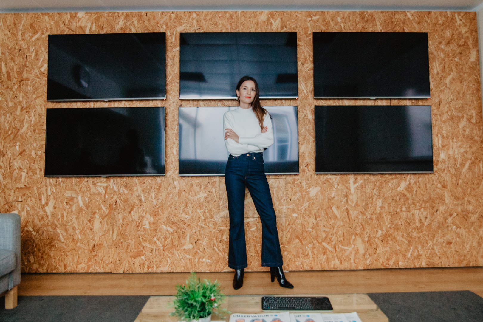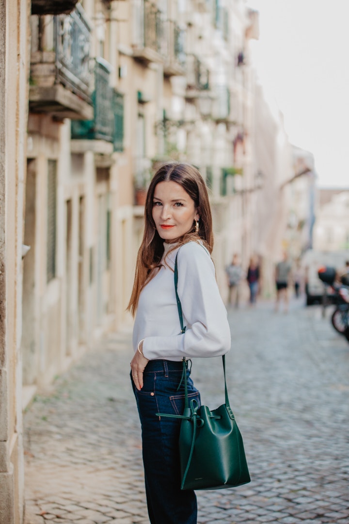- Os jeans apresentam-se com largura suficiente para que o cano das botas suba por dentro da bainha e são simultaneamente curtos para que nenhum sapato fique escondido. A linha da cintura é alta e bastante marcada, de forma a criar uma silhueta mais feminina reste registo tão ‘a direito’.